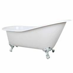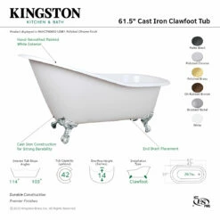 Surround yourself with the perfumed aroma of your favorite candle, grab your favorite piece of literature, and soak all of the stresses of the day away with the all-encompassing embrace of one of Kingston Brass’ finest products, the clawfoot tub. Since the late 19th century, the claw foot tub has stood prominent among bathroom fixtures for its outstanding grandeur. The Aqua Eden 61-inch cast iron slipper clawfoot tub will wholly beautify your home for years to come thanks to its durable and heavy cast iron construction. Elegantly crafted clawfoot tub feet are included to further elevate your home’s traditional eminence. Aside from its feet, this bathtub is enameled in glossy white for a classic look, exceptional durability, and easy care and maintenance for years to come.