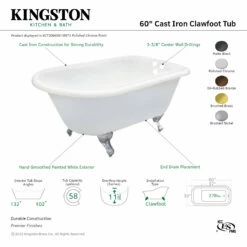 Surround yourself with the perfumed aroma of your favorite candle, grab your favorite piece of literature, and soak all of the stresses of the day away with the all-encompassing embrace of one of Kingston Brass’ finest products, the clawfoot tub. Since the late 19th century, the claw foot tub has stood prominent among bathroom fixtures for its outstanding grandeur. The Aqua Eden 60-inch cast iron roll top clawfoot tub with 3-3/8-inch tub wall drillings will wholly beautify your home for years to come thanks to its durable and heavy cast iron construction. Elegantly crafted clawfoot tub feet are included to further elevate your home’s traditional eminence. Aside from its feet, this bathtub is enameled in glossy white for a classic look, exceptional durability, and easy care and maintenance for years to come.