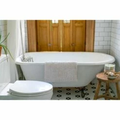- Bathtub finished in glossy white enamel on inside and top rim, matte white on outside