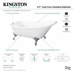 Surround yourself with the perfumed aroma of your favorite candle, grab your favorite piece of literature, and soak all of the stresses of the day away with the all-encompassing embrace of one of Kingston Brass’ finest products, the clawfoot tub. Since the late 19th century, the claw foot tub has stood prominent among bathroom fixtures for its outstanding grandeur. The Kingston Brass Aqua Eden 67-inch cast iron single slipper clawfoot tub with 7-inch faucet drillings will wholly beautify your home for years to come thanks to its durable and heavy cast iron construction. Elegantly crafted clawfoot tub feet are included to further elevate your home’s traditional eminence. Aside from its feet, this bathtub is enameled in glossy white for a classic look, exceptional durability, and easy care and maintenance for years to come.