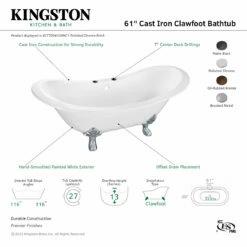Surround yourself with the perfumed aroma of your favorite candle, grab your favorite piece of literature, and soak all of the stresses of the day away with the all-encompassing embrace of one of Kingston Brass’ finest products, the clawfoot tub. Since the late 19th century, the claw foot tub has stood prominent among bathroom fixtures for its outstanding grandeur. The Kingston Brass Aqua Eden 61-inch cast iron double slipper clawfoot tub with 7-inch faucet drillings will wholly beautify your home for years to come thanks to its durable and heavy cast iron construction. Elegantly crafted clawfoot tub feet are included to further elevate your home’s traditional eminence. Aside from its feet, this bathtub is enameled in glossy white for a classic look, exceptional durability, and easy care and maintenance for years to come.