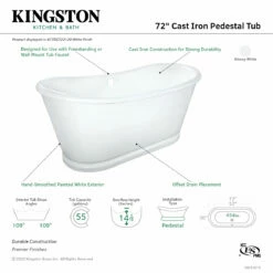 Elevate your home’s contemporary decorum, while you effortlessly recline in the cozy embrace of a Kingston Brass pedestal bathtub. Highly acclaimed for its clean and contemporary yet minimalist shape, this tub will be made the focal point in many bathrooms. The Aqua Eden 72-inch cast iron skirted pedestal tub will wholly beautify your home for years to come thanks to its durable and heavy cast iron construction. This bathtub is enameled in glossy white for a classic look, exceptional durability, and easy care and maintenance for years to come.