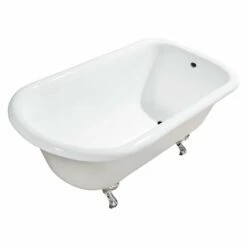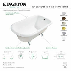 Surround yourself with the perfumed aroma of your favorite candle, grab your favorite piece of literature, and soak all of the stresses of the day away with the all-encompassing embrace of one of Kingston Brass’ finest products, the clawfoot tub. Since the late 19th century, the claw foot tub has stood prominent among bathroom fixtures for its outstanding grandeur. The Aqua Eden 48-inch cast iron roll top clawfoot tub (no faucet drillings) will wholly beautify your home for years to come thanks to its durable and heavy cast iron construction. Elegantly crafted clawfoot tub feet are included to further elevate your home’s traditional eminence. Aside from its feet, this bathtub is enameled in glossy white for a classic look, exceptional durability, and easy care and maintenance for years to come.