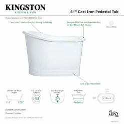 Elevate your home’s contemporary decorum, while you effortlessly recline in the cozy embrace of a Kingston Brass pedestal bathtub. Highly acclaimed for its clean and contemporary yet minimalist shape, this tub will be made the focal point in many bathrooms. The Aqua Eden 51-inch cast iron skirted pedestal tub will wholly beautify your home for years to come thanks to its durable and heavy cast iron construction. This bathtub is enameled in glossy white for a classic look, exceptional durability, and easy care and maintenance for years to come.