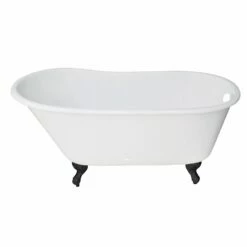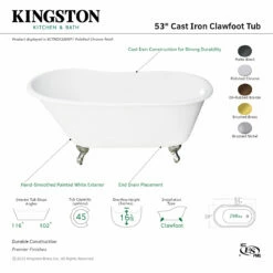 Surround yourself with the perfumed aroma of your favorite candle, grab your favorite piece of literature, and soak all of the stresses of the day away with the all-encompassing embrace of one of Kingston Brass’ finest products, the clawfoot tub. Since the late 19th century, the claw foot tub has stood prominent among bathroom fixtures for its outstanding grandeur. The Aqua Eden 53-inch cast iron slipper clawfoot tub will wholly beautify your home for years to come thanks to its durable and heavy cast iron construction. Elegantly crafted clawfoot tub feet are included to further elevate your home’s traditional eminence. Aside from its feet, this bathtub is enameled in glossy white for a classic look, exceptional durability, and easy care and maintenance for years to come.
