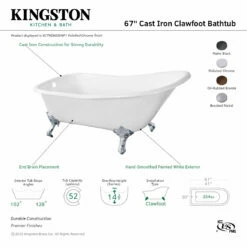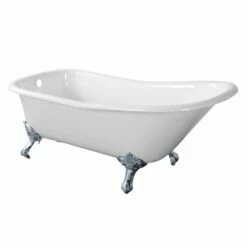 Surround yourself with the perfumed aroma of your favorite candle, grab your favorite piece of literature, and soak all of the stresses of the day away with the all-encompassing embrace of one of Kingston Brass’ finest products, the clawfoot tub. Since the late 19th century, the claw foot tub has stood prominent among bathroom fixtures for its outstanding grandeur. The Kingston Brass Aqua Eden 67-inch cast iron single slipper clawfoot tub (no faucet drillings) will wholly beautify your home for years to come thanks to its durable and heavy cast iron construction. Elegantly crafted clawfoot tub feet are included to further elevate your home’s traditional eminence. Aside from its feet, this bathtub is enameled in glossy white for a classic look, exceptional durability, and easy care and maintenance for years to come.