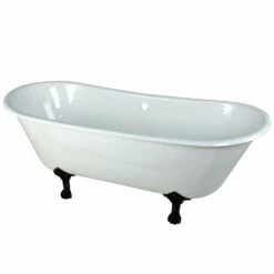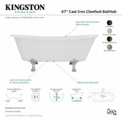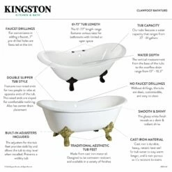 Surround yourself with the perfumed aroma of your favorite candle, grab your favorite piece of literature, and soak all of the stresses of the day away with the all-encompassing embrace of one of Kingston Brass’ finest products, the clawfoot tub. Since the late 19th century, the claw foot tub has stood prominent among bathroom fixtures for its outstanding grandeur. The Aqua Eden 67-inch cast iron double slipper clawfoot tub (without faucet drillings) will wholly beautify your home for years to come thanks to its durable and heavy cast iron construction. Elegantly crafted clawfoot tub feet are included to further elevate your home’s traditional eminence. Aside from its feet, this bathtub is enameled in glossy white for a classic look, exceptional durability, and easy care and maintenance for years to come.