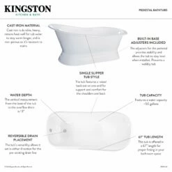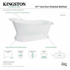 Incorporate the regal beauty of a Kingston Brass pedestal tub for years and years of luxury baths suitable for royalty. Pedestal tubs are generally categorized as the contemporary descendant of the classic clawfoot tub. However, unlike the clawfoot tub, pedestal tubs rely on a solid base ring bordering the bottom perimeter to support and raise it off the floor, giving it a one-of-a-kind personality. The Aqua Eden 67 in. cast iron pedestal tub (no faucet drillings) will wholly beautify your home for years to come thanks to its durable and heavy cast iron construction. This bathtub is enameled in glossy white for a classic look, exceptional durability, and easy care and maintenance for years to come.