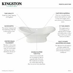 Incorporate the regal beauty of a Kingston Brass pedestal tub for years and years of luxury baths suitable for royalty. Pedestal tubs are generally categorized as the contemporary descendant of the classic clawfoot tub. However, unlike the clawfoot tub, pedestal tubs rely on a solid base ring bordering the bottom perimeter to support and raise it off the floor, giving it a one-of-a-kind personality. The Aqua Eden 72-inch cast iron Double Slipper Pedestal Tub No Faucet Drillings will wholly beautify your home for years to come thanks to its durable and heavy cast iron construction. This bathtub is enameled in glossy white for a classic look, exceptional durability, and easy care and maintenance for years to come.