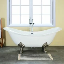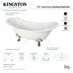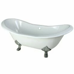 Surround yourself with the perfumed aroma of your favorite candle, grab your favorite piece of literature, and soak all of the stresses of the day away with the all-encompassing embrace of one of Kingston Brass’ finest products, the clawfoot tub. Since the late 19th century, the claw foot tub has stood prominent among bathroom fixtures for its outstanding grandeur. The Aqua Eden 72-inch cast iron double slipper clawfoot tub will wholly beautify your home for years to come thanks to its durable and heavy cast iron construction. Elegantly crafted clawfoot tub feet are included to further elevate your home’s traditional eminence. Aside from its feet, this bathtub is enameled in glossy white for a classic look, exceptional durability, and easy care and maintenance for years to come.