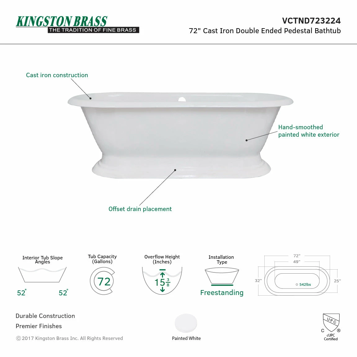 Aqua Eden VCTND723224 72-Inch Cast Iron Double Ended Pedestal Tub (No Faucet Drillings), White