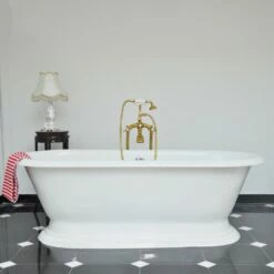 - No faucet drillings, will accommodate any freestanding or wall mounted roman tub faucet