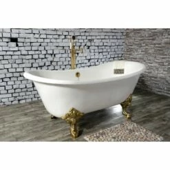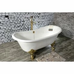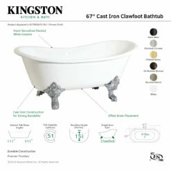Surround yourself with the perfumed aroma of your favorite candle, grab your favorite piece of literature, and soak all of the stresses of the day away with the all-encompassing embrace of one of Kingston Brass’ finest products, the clawfoot tub. Since the late 19th century, the claw foot tub has stood prominent among bathroom fixtures for its outstanding grandeur. The Kingston Brass Aqua Eden 67-inch cast iron double slipper clawfoot tub (no faucet drillings) will wholly beautify your home for years to come thanks to its durable and heavy cast iron construction. Elegantly crafted clawfoot tub feet are included to further elevate your home’s traditional eminence. Aside from its feet, this bathtub is enameled in glossy white for a classic look, exceptional durability, and easy care and maintenance for years to come.