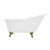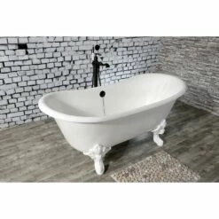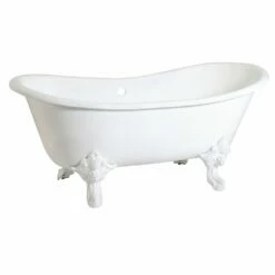 Surround yourself with the perfumed aroma of your favorite candle, grab your favorite piece of literature, and soak all of the stresses of the day away with the all-encompassing embrace of one of Kingston Brass’ finest products, the clawfoot tub. Since the late 19th century, the claw foot tub has stood prominent among bathroom fixtures for its outstanding grandeur. The Kingston Brass Aqua Eden 67-inch cast iron double slipper clawfoot tub (no faucet drillings) will wholly beautify your home for years to come thanks to its durable and heavy cast iron construction. Elegantly crafted clawfoot tub feet are included to further elevate your home’s traditional eminence. This bathtub is enameled in glossy white for a classic look, exceptional durability, and easy care and maintenance for years to come, and its feet are a glossy white to match.
