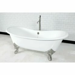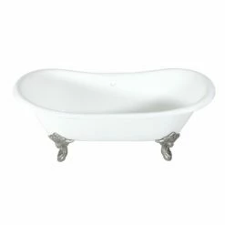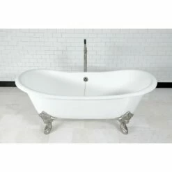 Surround yourself with the perfumed aroma of your favorite candle, grab your favorite piece of literature, and soak all of the stresses of the day away with the all-encompassing embrace of one of Kingston Brass’ finest products, the clawfoot tub. Since the late 19th century, the claw foot tub has stood prominent among bathroom fixtures for its outstanding grandeur. The Kingston Brass Aqua Eden 72-inch cast iron double slipper clawfoot tub (no faucet drillings) will wholly beautify your home for years to come thanks to its durable and heavy cast iron construction. Elegantly crafted clawfoot tub feet are included to further elevate your home’s traditional eminence. Aside from its feet, this bathtub is enameled in glossy white for a classic look, exceptional durability, and easy care and maintenance for years to come.