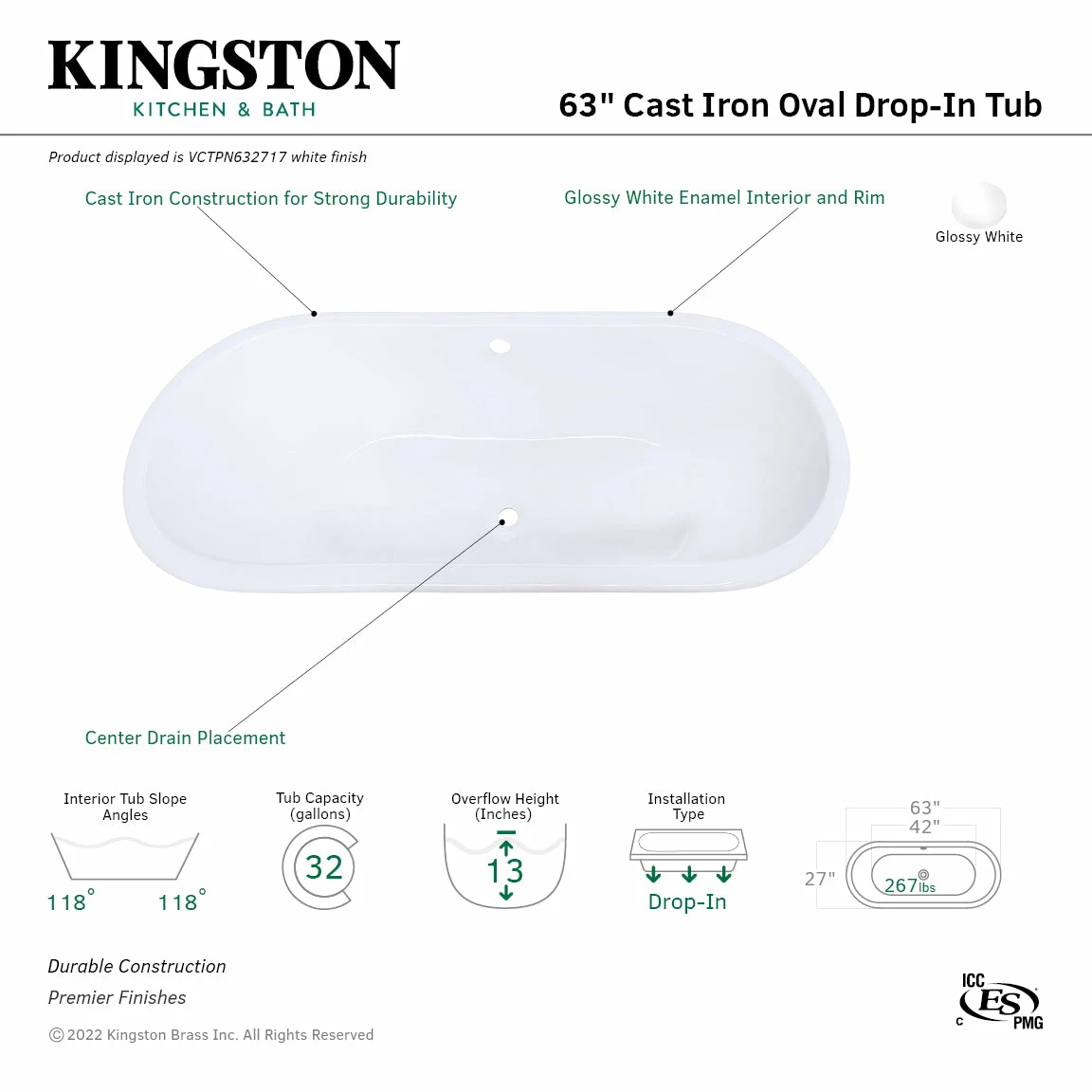 Aqua Eden VCTPN632717 63-Inch Cast Iron Oval Drop-In Tub with Center Drain Hole, White