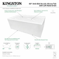 Create lasting memories of bubble baths with your children, or relax from the days stresses with a top-notch alcove tub by Kingston Brass. The alcove tub is the perfect addition to your home if you want pristine performance and polished refinery. This bathtub is finished inside and out in a brilliant, high-gloss white that ensures crisp aesthetics and easy care now and well in the future. The Aqua Eden 60-inch acrylic curved apron alcove tub will beautify your home for years to come, thanks to its durable and easily repairable acrylic construction.