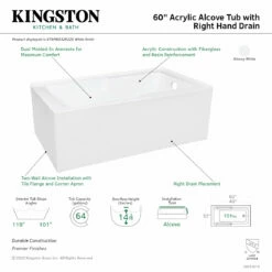 Indulge in blissful bubble baths with your little ones or unwind after a long day in ultimate luxury. Introducing our exquisite alcove tub, designed to transform your bathroom into a serene spa retreat. The Aqua Eden 60-inch acrylic rectangular apron alcove tub is a stunning addition that will enhance your home’s beauty for years to come. Crafted with durable and easily repairable acrylic construction, this tub guarantees lasting quality. Its captivating high-gloss white finish, both inside and out, promises a pristine look and effortless maintenance, ensuring timeless elegance and easy care for years to come. Elevate your bathing experience with this 60″ tub, and let relaxation and style become the defining features of your bathroom oasis.