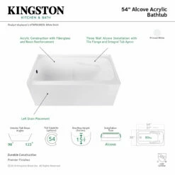 Create lasting memories of bubble baths with your children or relax from the stresses of the day with a top-notch alcove tub by Kingston Brass. Extremely user-friendly with effortless installation and simplistic construction, the alcove tub is the perfect addition to your home if you are looking for pristine performance and polished refinery. The Aqua Eden 54-inch acrylic alcove tub with left hand drain hole and arm rest will wholly beautify your home for years to come thanks to its durable and easily repairable acrylic construction. This bathtub is finished inside and out in a brilliant, high-gloss white that ensures crisp aesthetics and easy care now and well in the future.