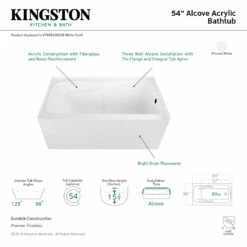 Create lasting memories of bubble baths with your children or relax from the stresses of the day with a top-notch alcove tub by Kingston Brass. Extremely user-friendly with effortless installation and simplistic construction, the alcove tub is the perfect addition to your home if you are looking for pristine performance and polished refinery. The Aqua Eden 54-inch acrylic alcove tub with right hand drain hole and arm rest will wholly beautify your home for years to come thanks to its durable and easily repairable acrylic construction. This bathtub is finished inside and out in a brilliant, high-gloss white that ensures crisp aesthetics and easy care now and well in the future.