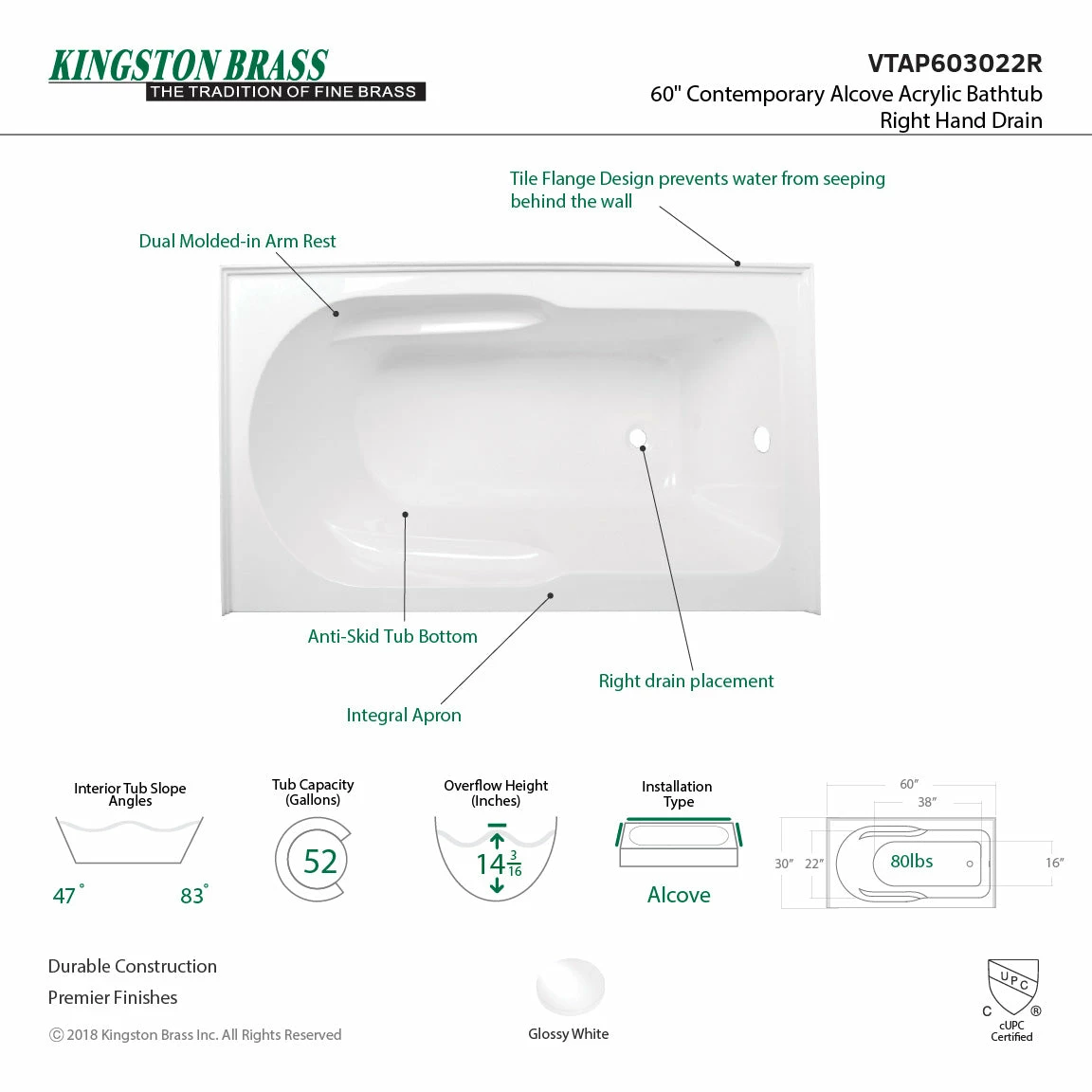 Create lasting memories of bubble baths with your children or relax from the stresses of the day with a top-notch alcove tub by Kingston Brass. Extremely user-friendly with effortless installation and simplistic construction, the alcove tub is the perfect addition to your home if you are looking for pristine performance and polished refinery. The Aqua Eden 60-inch acrylic alcove tub with anti skid and right hand drain hole will wholly beautify your home for years to come thanks to its durable and easily repairable acrylic construction. Drain and overflow assembly sold separately. This bathtub is finished inside and out in a brilliant, high-gloss white that ensures crisp aesthetics and easy care now and well in the future.