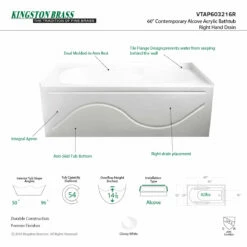 Create lasting memories of bubble baths with your children or relax from the stresses of the day with a top-notch alcove tub by Kingston Brass. Extremely user-friendly with effortless installation and simplistic construction, the alcove tub is the perfect addition to your home if you are looking for pristine performance and polished refinery. The Aqua Eden 60-inch acrylic alcove tub with anti skid and right hand drain hole will wholly beautify your home for years to come thanks to its durable and easily repairable acrylic construction. Drain and overflow assembly sold separately. This bathtub is finished inside and out in a brilliant, high-gloss white that ensures crisp aesthetics and easy care now and well in the future.