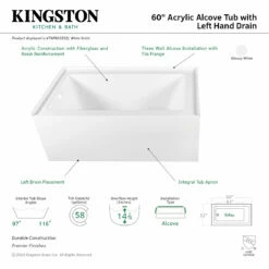 Create lasting memories of bubble baths with your children or relax from the stresses of the day with a top-notch alcove tub by Kingston Brass. Extremely user-friendly with effortless installation and simplistic construction, the alcove tub is the perfect addition to your home if you are looking for pristine performance and polished refinery. The Aqua Eden 60-inch acrylic alcove tub with left hand drain hole will wholly beautify your home for years to come thanks to its durable and easily repairable acrylic construction. This bathtub is finished inside and out in a brilliant, high-gloss white that ensures crisp aesthetics and easy care now and well in the future.