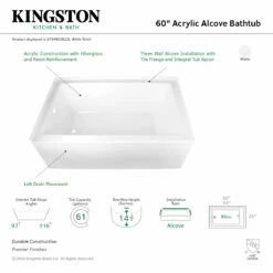 Create lasting memories of bubble baths with your children or relax from the stresses of the day with a top-notch alcove tub by Kingston Brass. Extremely user-friendly with effortless installation and simplistic construction, the alcove tub is the perfect addition to your home if you are looking for pristine performance and polished refinery. The Aqua Eden 60-inch acrylic alcove tub with left hand drain hole will wholly beautify your home for years to come thanks to its durable and easily repairable acrylic construction. This bathtub is finished inside and out in a brilliant, high-gloss white that ensures crisp aesthetics and easy care now and well in the future.