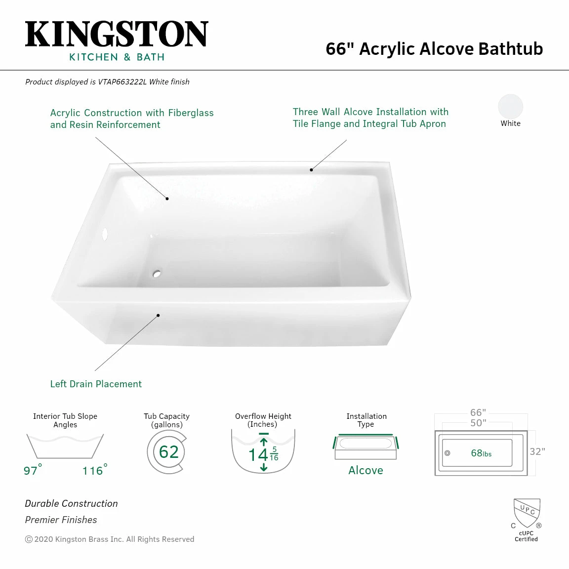 Aqua Eden VTAP663222L 66-Inch Acrylic Alcove Tub with Left Hand Drain Hole, White