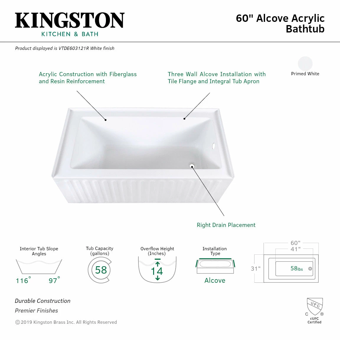 Aqua Eden VTDE603121R 60-Inch Acrylic Alcove Tub with Right Hand Drain Hole, White