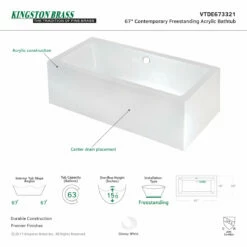 Elevate your home’s contemporary decorum, while you effortlessly recline in the cozy embrace of a Kingston Brass freestanding bathtub. Highly acclaimed for its clean and contemporary yet minimalist shape, this tub will be made the focal point in many bathrooms. The Aqua Eden 67-Inch Acrylic Freestanding Rectangular Tub with Drain will wholly beautify your home for years to come thanks to its durable and easily repairable acrylic construction. This bathtub is finished inside and out in a brilliant, high-gloss white that ensures crisp aesthetics and easy care now and well in the future.
