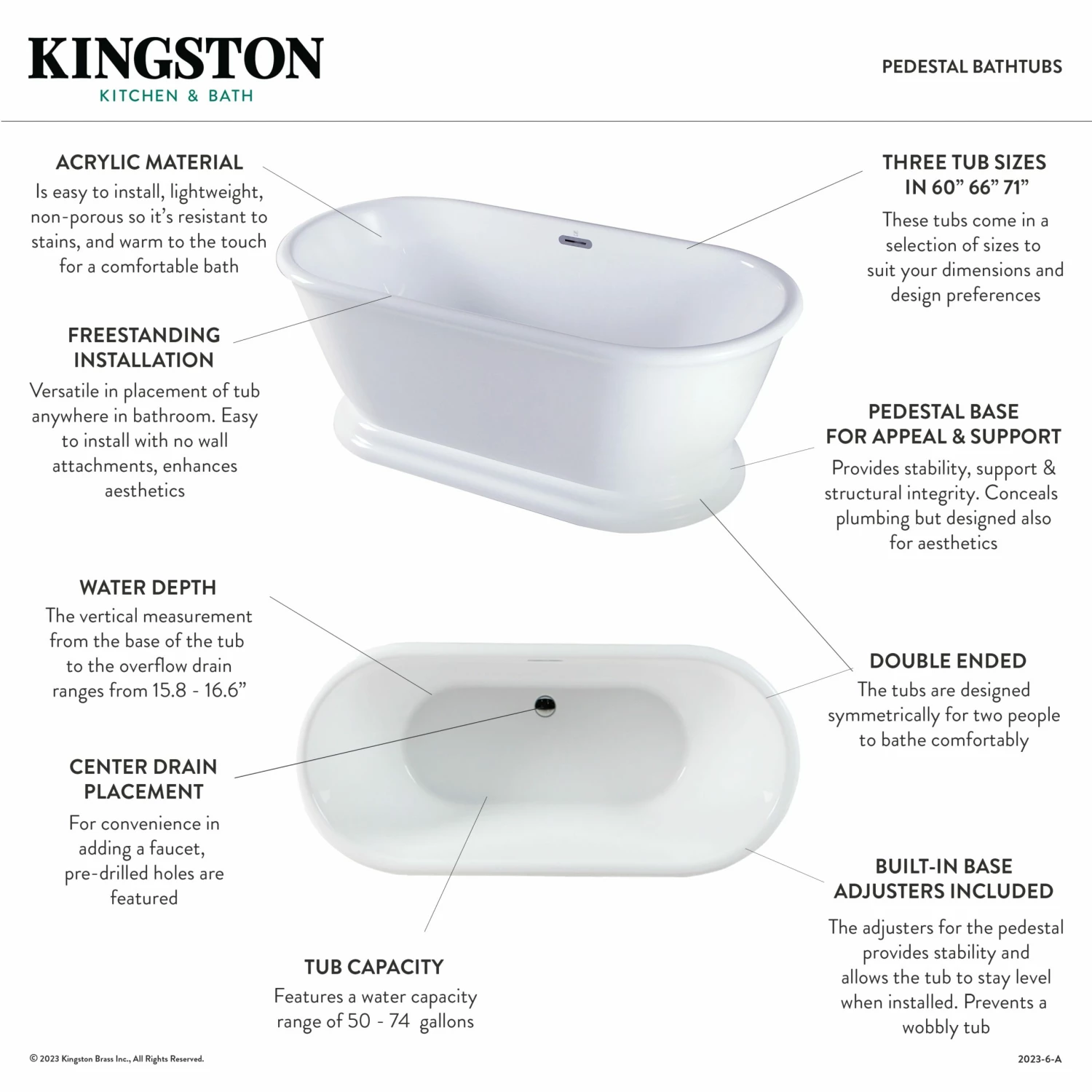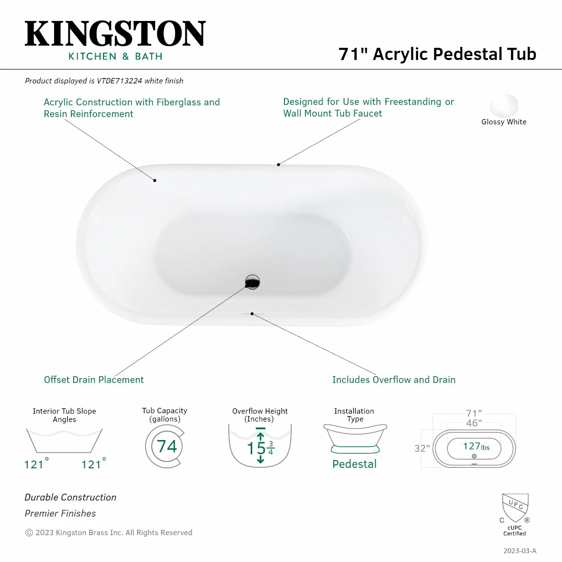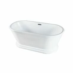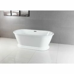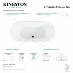 Incorporate the regal beauty of a Kingston Brass pedestal tub for years and years of luxury baths suitable for royalty. Pedestal tubs are generally categorized as the contemporary descendant of the classic clawfoot tub. However, unlike the clawfoot tub, pedestal tubs rely on a solid base ring bordering the bottom perimeter to support and raise it off the floor, giving it a one-of-a-kind personality. The 71-inch acrylic double ended pedestal bathtub with drain will wholly beautify your home for years to come thanks to its durable and easily repairable acrylic construction. This bathtub is finished inside and out in a brilliant, high-gloss white that ensures crisp aesthetics and easy care now and well in the future.