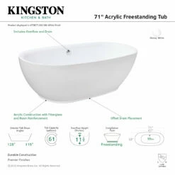 Elevate your home’s contemporary decorum, while you effortlessly recline in the cozy embrace of a Kingston Brass freestanding bathtub. Highly acclaimed for its clean and contemporary yet minimalist shape, this tub will be made the focal point in many bathrooms. The Aqua Eden 71 in. acrylic freestanding oval bathtub will wholly beautify your home for years to come thanks to its durable and easily repairable acrylic construction. This bathtub is finished inside and out in a brilliant, high-gloss white that ensures crisp aesthetics and easy care now and well in the future. Includes overflow and drain.