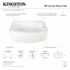 Create lasting memories of bubble baths with your children or relax from the stresses of the day with a top-notch alcove tub by Kingston Brass. Extremely user-friendly with effortless installation and simplistic construction, the alcove tub is the perfect addition to your home if you are looking for pristine performance and polished refinery. The Aqua Eden 60-inch acrylic alcove tub with right hand drain hole will wholly beautify your home for years to come thanks to its durable and easily repairable acrylic construction. This bathtub is finished inside and out in a brilliant, high-gloss white that ensures crisp aesthetics and easy care now and well in the future.
