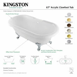 Surround yourself with the perfumed aroma of your favorite candle, grab your favorite piece of literature, and soak all of the stresses of the day away with the all-encompassing embrace of one of Kingston Brass’ finest products, the clawfoot tub. Since the late 19th century, the claw foot tub has stood prominent among bathroom fixtures for its outstanding grandeur. The Aqua Eden 67-inch acrylic clawfoot tub (no faucet drillings) will wholly beautify your home for years to come thanks to its durable and easily repairable acrylic construction. Elegantly crafted clawfoot tub feet are included to further elevate your home’s traditional eminence. Aside from its feet, this bathtub is finished inside and out in a brilliant, high-gloss white that ensures crisp aesthetics and easy care now and well in the future.