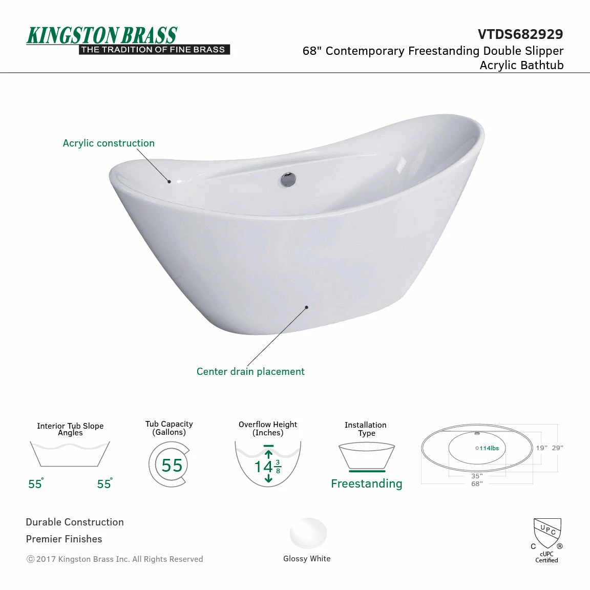 Elevate your home’s contemporary decorum, while you effortlessly recline in the cozy embrace of a Kingston Brass freestanding bathtub. Highly acclaimed for its clean and contemporary yet minimalist shape, this tub will be made the focal point in many bathrooms. The Aqua Eden 68-Inch Acrylic Freestanding Double Slipper Acrylic Tub with Drain will wholly beautify your home for years to come thanks to its durable and easily repairable acrylic construction. This bathtub is finished inside and out in a brilliant, high-gloss white that ensures crisp aesthetics and easy care now and well in the future.