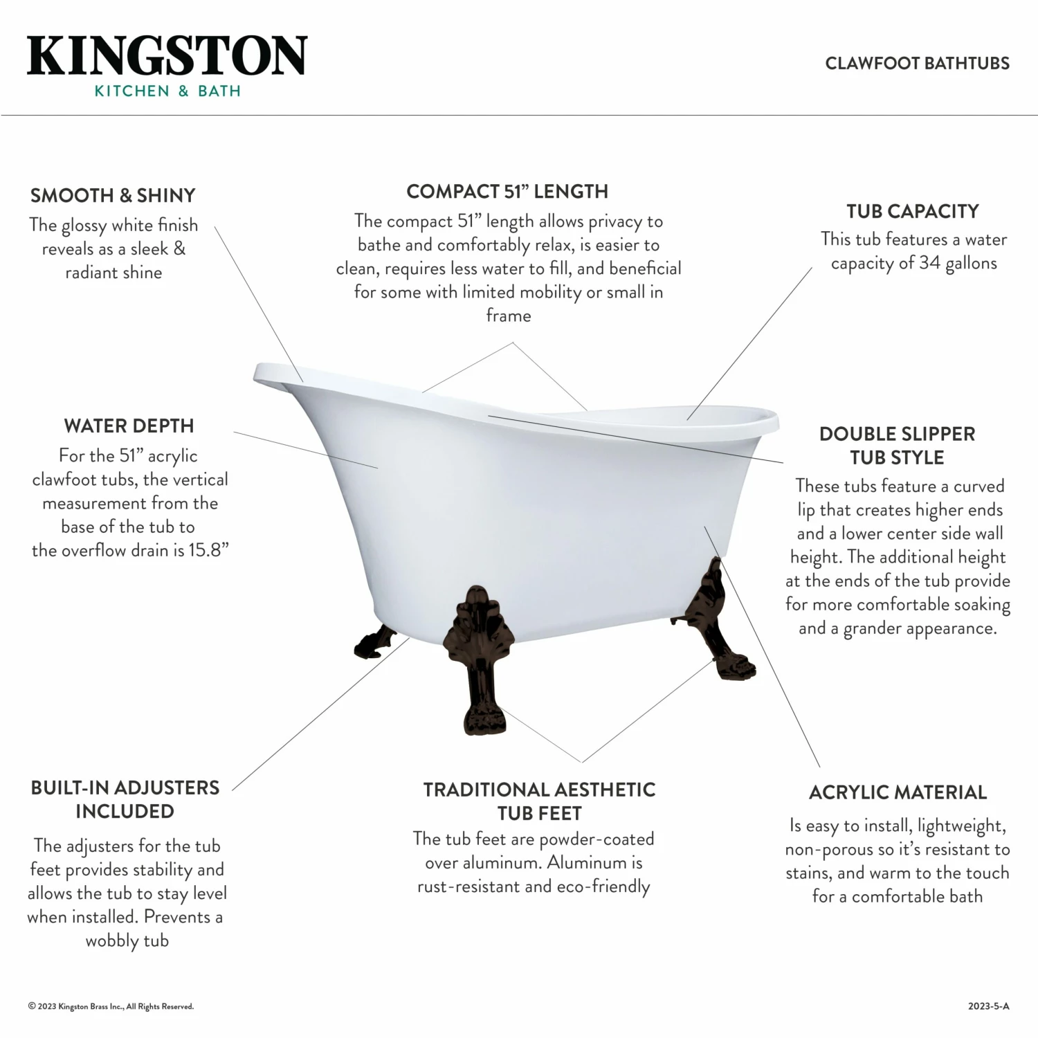 Surround yourself with the perfumed aroma of your favorite candle, grab your favorite piece of literature, and soak all of the stresses of the day away with the all-encompassing embrace of one of Kingston Brass’ finest products, the clawfoot tub. Since the late 19th century, the claw foot tub has stood prominent among bathroom fixtures for its outstanding grandeur. The 51-inch acrylic clawfoot tub will wholly beautify your home for years to come thanks to its durable and easily repairable acrylic construction. Elegantly crafted clawfoot tub feet are included to further elevate your home’s traditional eminence. Aside from its feet, this bathtub is finished inside and out in a brilliant, high-gloss white that ensures crisp aesthetics and easy care now and well in the future.