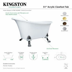 Surround yourself with the perfumed aroma of your favorite candle, grab your favorite piece of literature, and soak all of the stresses of the day away with the all-encompassing embrace of one of Kingston Brass’ finest products, the clawfoot tub. Since the late 19th century, the claw foot tub has stood prominent among bathroom fixtures for its outstanding grandeur. The 51-inch acrylic clawfoot tub will wholly beautify your home for years to come thanks to its durable and easily repairable acrylic construction. Elegantly crafted clawfoot tub feet are included to further elevate your home’s traditional eminence. Aside from its feet, this bathtub is finished inside and out in a brilliant, high-gloss white that ensures crisp aesthetics and easy care now and well in the future.
