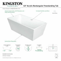 Elevate your home’s contemporary decorum, while you effortlessly recline in the cozy embrace of a Kingston Brass freestanding bathtub. Highly acclaimed for its clean and contemporary yet minimalist shape, this tub will be made the focal point in many bathrooms. The Aqua Eden 53-inch acrylic freestanding tub will wholly beautify your home for years to come thanks to its durable and easily repairable acrylic construction. Tub drain is included. This bathtub is finished inside and out in a brilliant, high-gloss white that ensures crisp aesthetics and easy care now and well in the future.