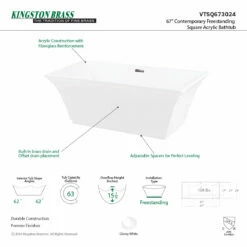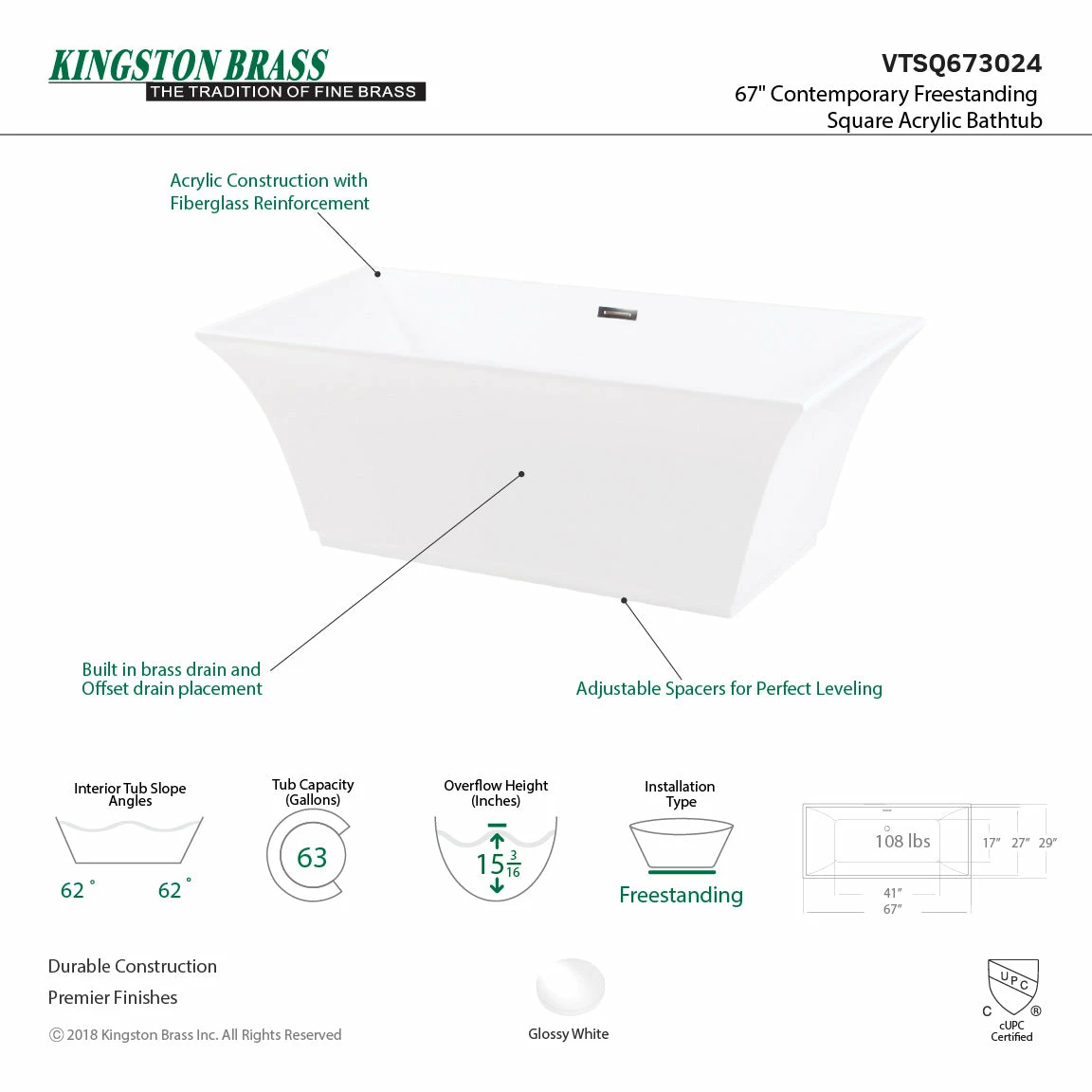 Elevate your home’s contemporary decorum, while you effortlessly recline in the cozy embrace of a Kingston Brass freestanding bathtub. Highly acclaimed for its clean and contemporary yet minimalist shape, this tub will be made the focal point in many bathrooms. The Aqua Eden 67-Inch Freestanding Square Acrylic Tub with Drain will wholly beautify your home for years to come thanks to its durable and easily repairable acrylic construction. This bathtub is finished inside and out in a brilliant, high-gloss white that ensures crisp aesthetics and easy care now and well in the future.