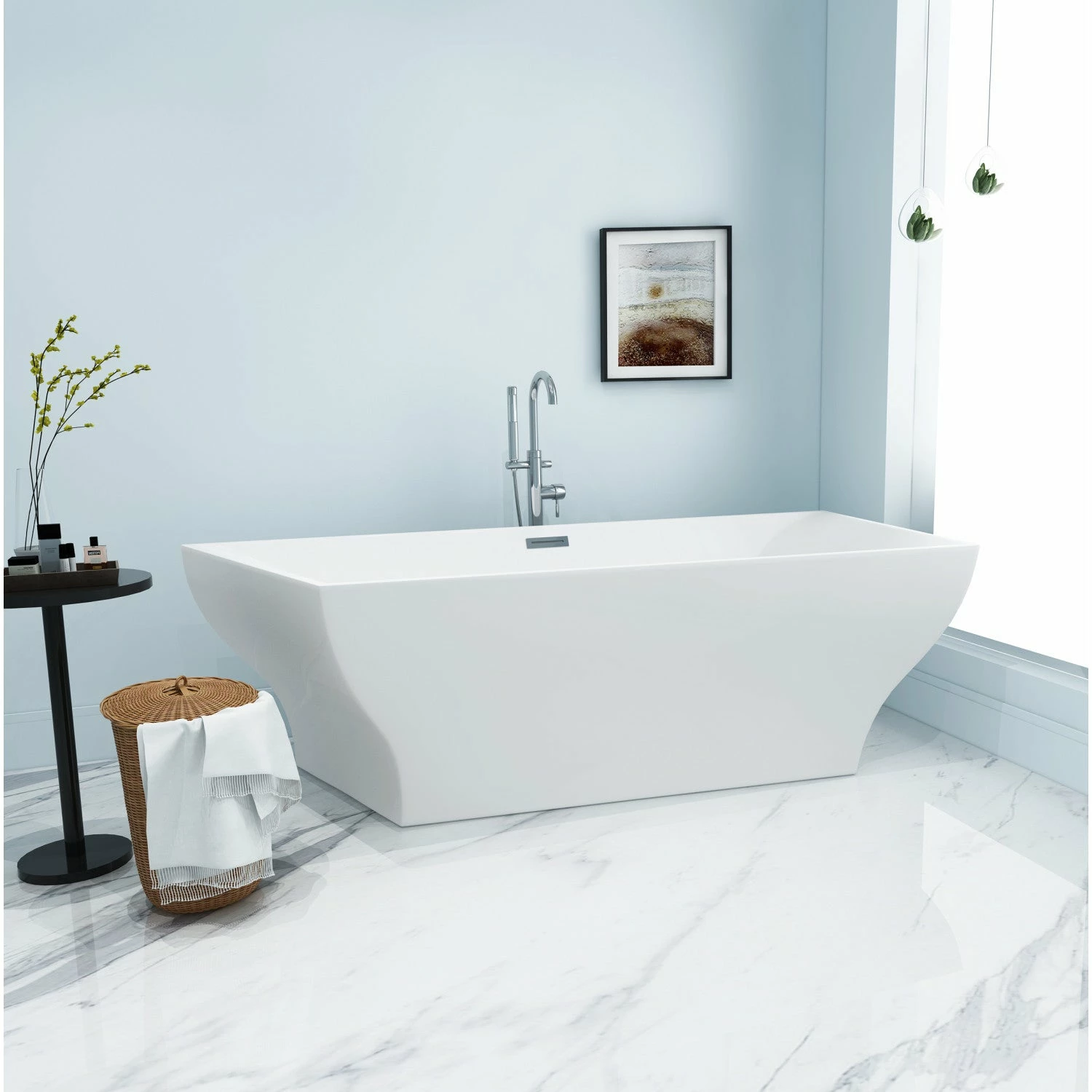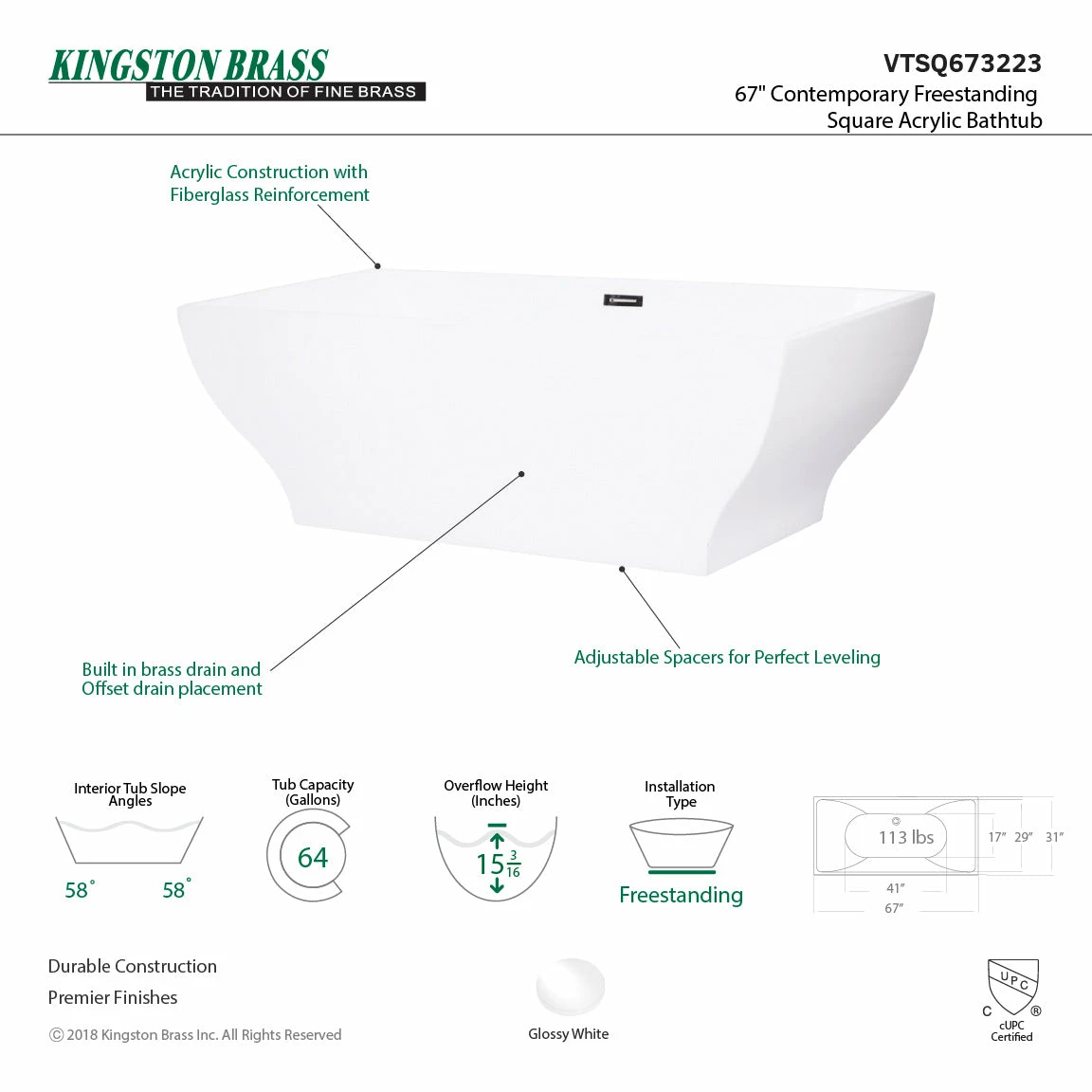 Elevate your home’s contemporary decorum, while you effortlessly recline in the cozy embrace of a Kingston Brass freestanding bathtub. Highly acclaimed for its clean and contemporary yet minimalist shape, this tub will be made the focal point in many bathrooms. The Aqua Eden 67-Inch Freestanding Square Acrylic Tub with Drain will wholly beautify your home for years to come thanks to its durable and easily repairable acrylic construction. This bathtub is finished inside and out in a brilliant, high-gloss white that ensures crisp aesthetics and easy care now and well in the future.