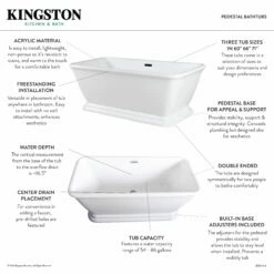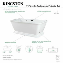Incorporate the regal beauty of a Kingston Brass pedestal tub for years and years of luxury baths suitable for royalty. Pedestal tubs are generally categorized as the contemporary descendant of the classic clawfoot tub. However, unlike the clawfoot tub, pedestal tubs rely on a solid base ring bordering the bottom perimeter to support and raise it off the floor, giving it a one-of-a-kind personality. The 71-inch acrylic rectangular pedestal bathtub with drain will wholly beautify your home for years to come thanks to its durable and easily repairable acrylic construction. This bathtub is finished inside and out in a brilliant, high-gloss white that ensures crisp aesthetics and easy care now and well in the future.