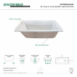 Aqua Eden XVTPN603020R 60-Inch Acrylic Rectangular Drop-In Tub with Right Hand Drain, White