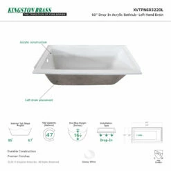 Aqua Eden XVTPN603220L 60-Inch Acrylic Rectangular Drop-In Tub with Left Hand Drain, White