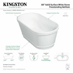 Elevate your home’s contemporary decorum, while you effortlessly recline in the cozy embrace of a Kingston Brass freestanding bathtub. Highly acclaimed for its clean and contemporary yet minimalist shape, this tub will be made the focal point in many bathrooms. The Aqua Eden Arcticstone 60-inch double ended solid surface freestanding tub wholly beautify your home for years to come thanks to its durable and scratch resistant solid surface white stone construction. This bathtub’s exterior is finished in an elegant matte white to bring high design into your space, and its interior and inner rim are polished to a glossy finish to make cleaning and care easier.