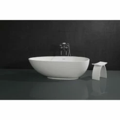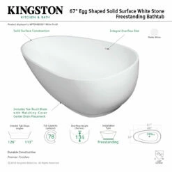 Elevate your home’s contemporary decorum, while you effortlessly recline in the cozy embrace of a Kingston Brass freestanding bathtub. Highly acclaimed for its clean and contemporary yet minimalist shape, this tub will be made the focal point in many bathrooms. The Aqua Eden Arcticstone 67-inch egg shaped solid surface freestanding tub wholly beautify your home for years to come thanks to its durable and scratch resistant solid surface white stone construction. This bathtub’s exterior is finished in an elegant matte white to bring high design into your space, and its interior and inner rim are polished to a glossy finish to make cleaning and care easier.
