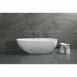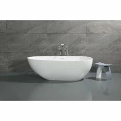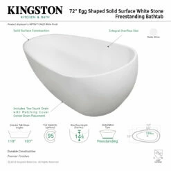 Elevate your home’s contemporary decorum, while you effortlessly recline in the cozy embrace of a Kingston Brass freestanding bathtub. Highly acclaimed for its clean and contemporary yet minimalist shape, this tub will be made the focal point in many bathrooms. The Aqua Eden Arcticstone 72-inch egg shaped solid surface freestanding tub with drain will wholly beautify your home for years to come thanks to its durable and scratch resistant solid surface white stone construction. This bathtub’s exterior is finished in an elegant matte white to bring high design into your space, and its interior and inner rim are polished to a glossy finish to make cleaning and care easier.