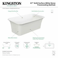 Elevate your home’s contemporary decorum, while you effortlessly recline in the cozy embrace of a Kingston Brass freestanding bathtub. Highly acclaimed for its clean and contemporary yet minimalist shape, this tub will be made the focal point in many bathrooms. The Aqua Eden 67-inch solid surface white stone freestanding tub with drain will wholly beautify your home for years to come thanks to its durable and scratch resistant solid surface white stone construction. This bathtub is finished inside and out in an elegant, high-design inspired matte white that brings subtle but unmistakable sophistication to the bathing experience.