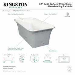 Elevate your home’s contemporary decorum, while you effortlessly recline in the cozy embrace of a Kingston Brass freestanding bathtub. Highly acclaimed for its clean and contemporary yet minimalist shape, this tub will be made the focal point in many bathrooms. The Aqua Eden 67-inch solid surface white stone freestanding tub with drain will wholly beautify your home for years to come thanks to its durable and scratch resistant solid surface white stone construction. This bathtub’s exterior is finished in a sultry matte grey to bring a uniquely sensual designer influence into your space, while its interior and inner rim are a crisp matte white for a clean graceful appearance.