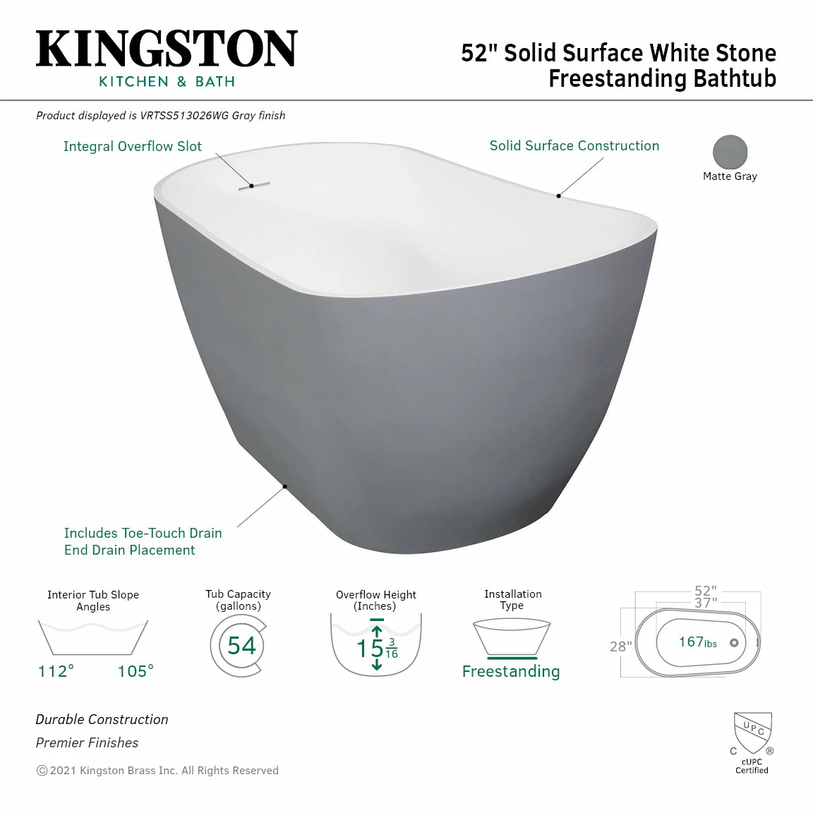 - Finished in elegant matte grey on exterior, polished glossy white on interior and tub rim